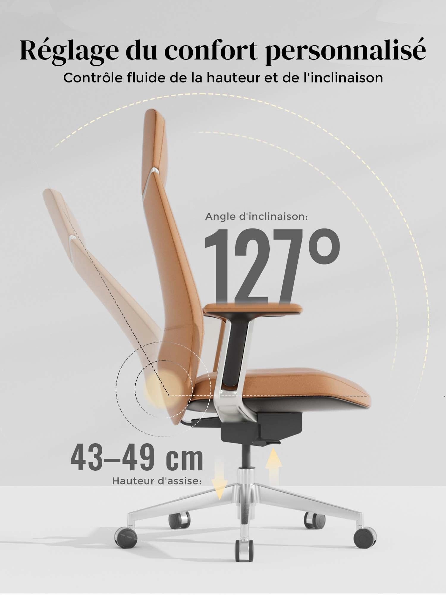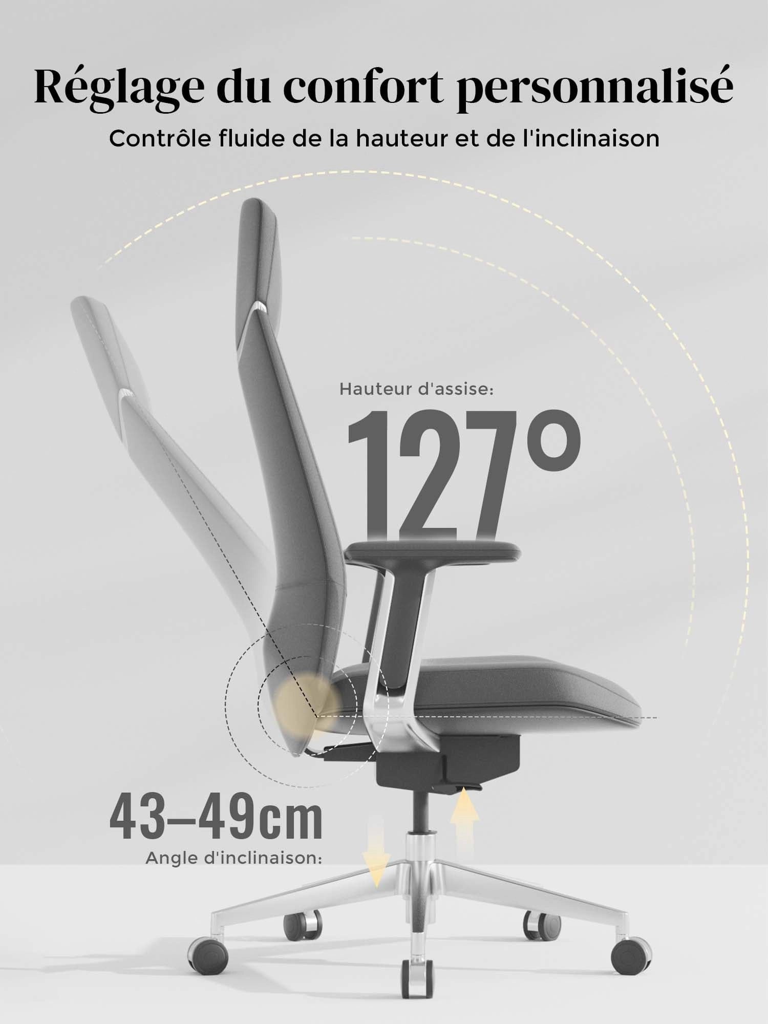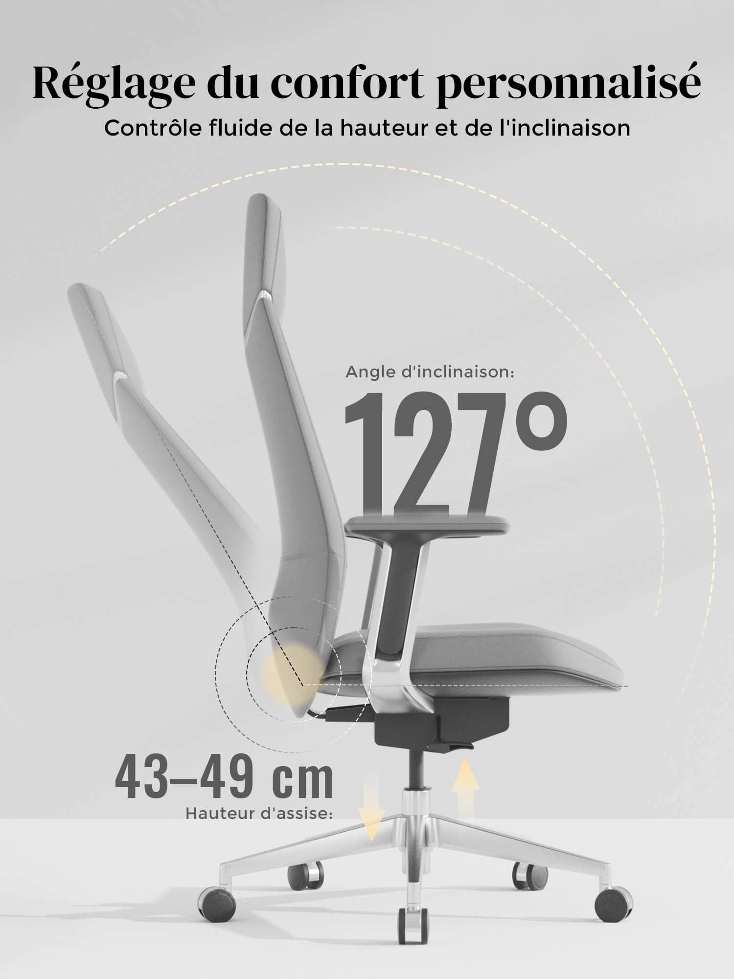 Le dossier permet une inclinaison stable et confortable jusqu’à 127°, pour se détendre facilement.