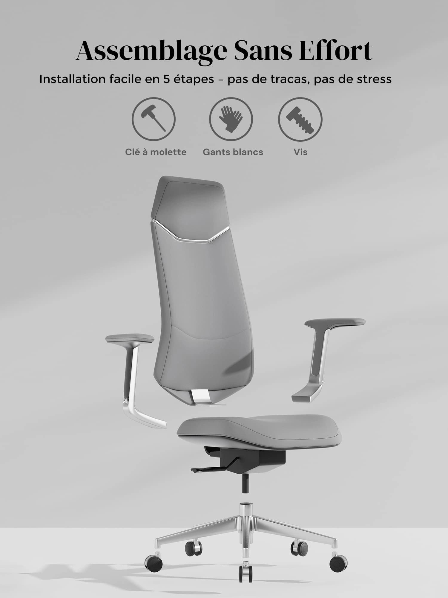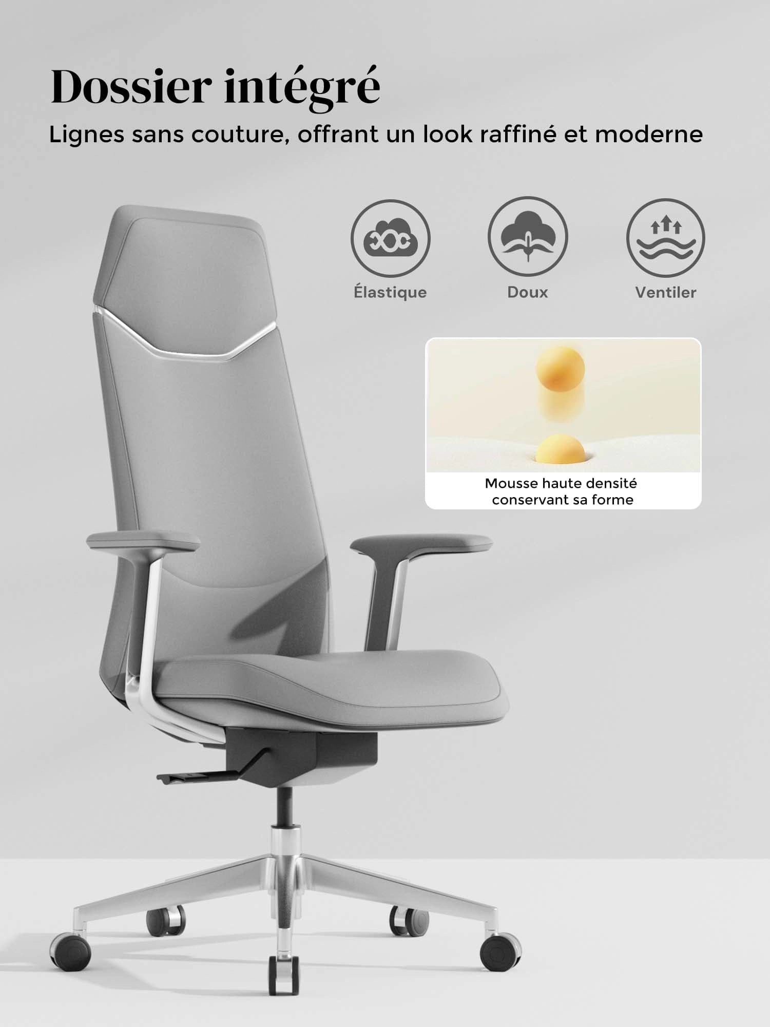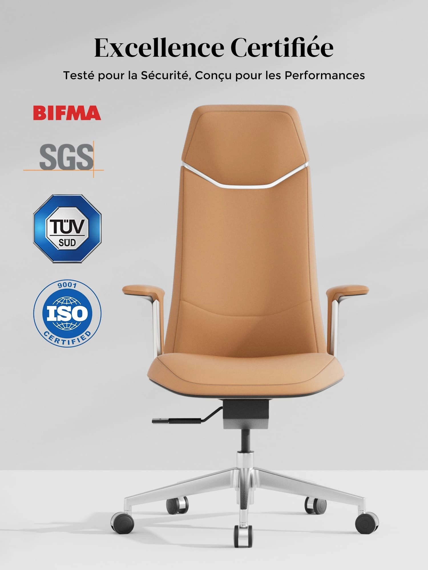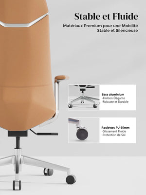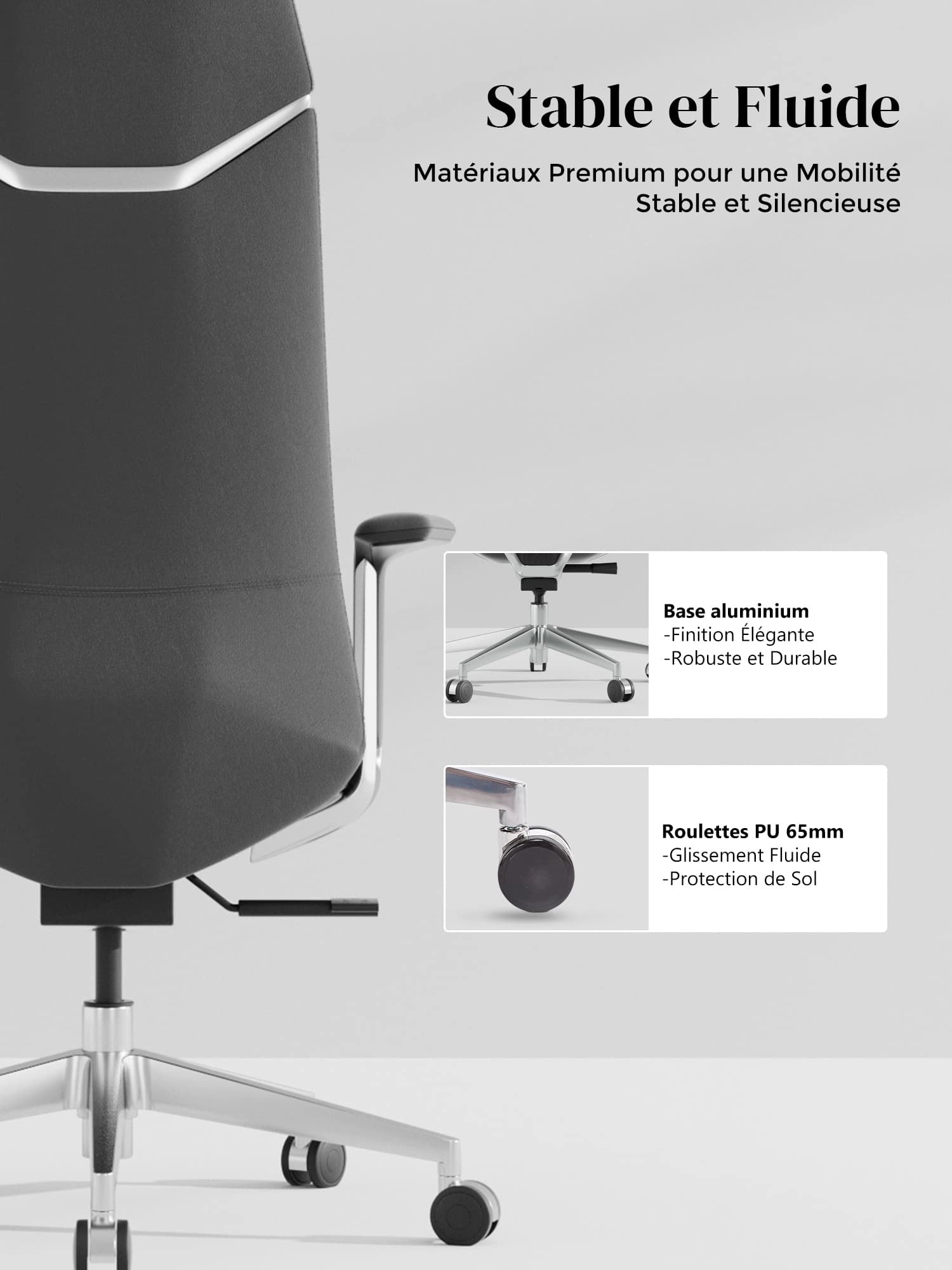 Roues semi-aluminium en PVC, certifiées SGS et Greenguard Gold, pour un déplacement sûr et silencieux.